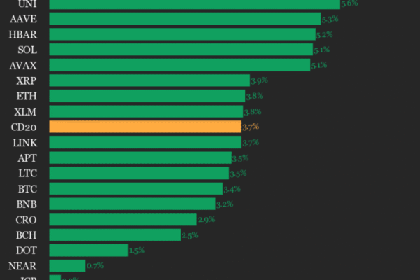 CoinDesk Indices presents its daily market update, highlighting the performance of leaders and laggards in the CoinDesk 20 Index. The CoinDesk 20 is currently trading at 2077.68, up 3.7% (+74.61) since 4 p.m. ET on Thursday. All 20 assets are trading higher. Leaders: SUI (+6.7%) and ADA (+5.8%). Laggards: ICP (+0.2%) and NEAR (+0.7%). The…