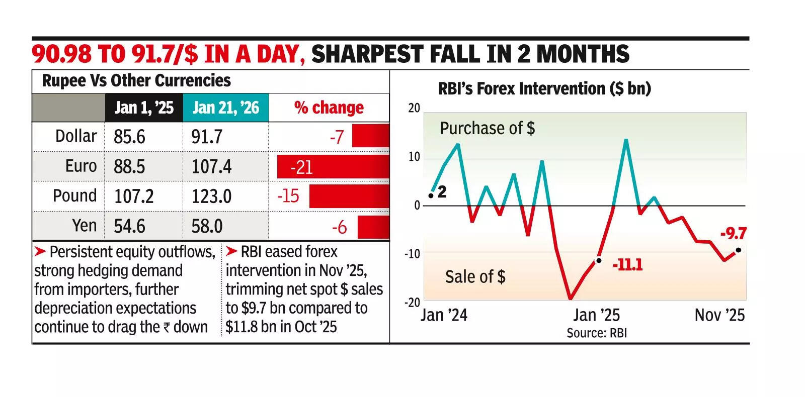 “With geopolitical issues deteriorating and no sign of any rollback in US tariffs on India’s exports-rather, talk of an additional 25% levy linked to trade with Iran-the rupee will remain under pressure. At the same time, foreign investors have continued to sell Indian equities, with net outflows of about $3.5 billion in Jan. In these circumstances, the rupee is unlikely to strengthen meaningfully except through RBI intervention,” said K N Dey a forex consultant.Meanwhile RBI data showed it eased forex intervention in Nov 2025, trimming net spot dollar sales to $9.7 billion compared to $11.8 billion in Oct. Despite such high sales, rising gold valuations have cushioned the hit to reserves. In Nov RBI spot operations saw $14.4 billion in purchases against $24.1 billion in sales, yielding net sales of $9.7 billion, or Rs 85,402 crore, at an implied rate of ~Rs 87.9 a dollar.“The positive consequence of the rupee’s movement is the export advantage at a time when we still face a 50% tariff in the USA. However, continued depreciation also increases uncertainty for corporates and can lead to greater caution,” said Sabnavis.Market participants said persistent equity outflows and stronger hedging demand from importers, amid expectations of further depreciation, continued to weigh on the currency. While India’s current account deficit remains manageable, weak capital inflows have left the rupee vulnerable to external shocks.Indian equities fell 0.3% on the day, extending losses after their steepest drop in more than eight months in the previous session. Foreign investors have pulled out about $3 billion from Indian equities so far in Jan, following record outflows of nearly $19 billion in 2025.