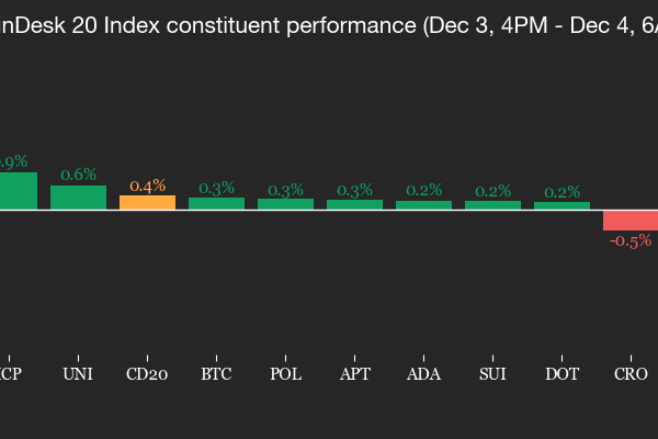 CoinDesk Indices presents its daily market update, highlighting the performance of leaders and laggards in the CoinDesk 20 Index. The CoinDesk 20 is currently trading at 2985.74, down 0.5% (-14.24) since 4 p.m. ET on Wednesday. Five of 20 assets are trading higher. Leaders: AVAX (+1.8%) and NEAR (+1.3%). Laggards: HBAR (-3.9%) and BCH (-3.2%)….