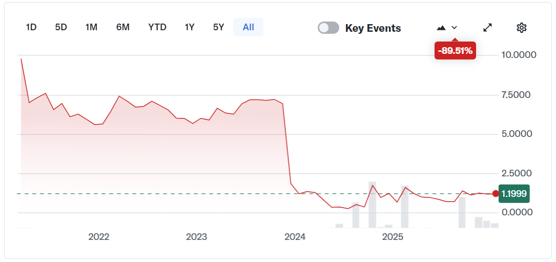 BitVentures’ share price decline has been dramatic. The company’s lifetime return as a public issuer stands at approximately negative 89%, according to data from Yahoo Finance.