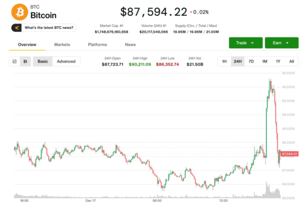 Major whipsaw on Wednesday sends price back below $88,000