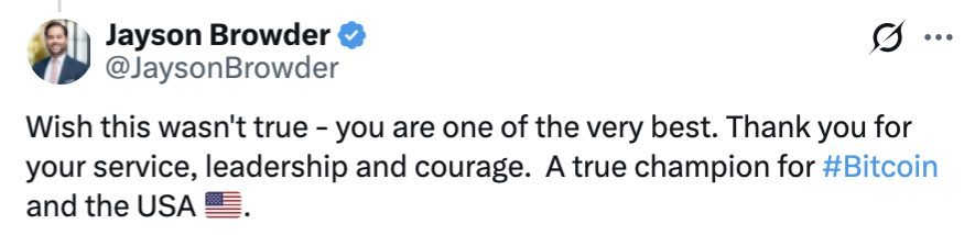 Bitcoin advocate and Coin Stories host Natalie Brunell also paid tribute, thanking Lummis for her “service and for helping move the Bitcoin cause forward.” “Wishing you a wonderful next chapter,” Brunnell said.