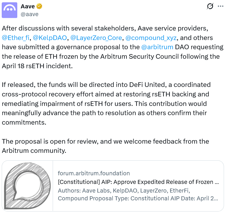 Backers have pledged over 43,500 ETH (around $101 million) in a coordinated “DeFi United” effort led by Aave, with participation from Lido DAO, Golem Foundation and major contributions from EtherFi Foundation and Mantle.