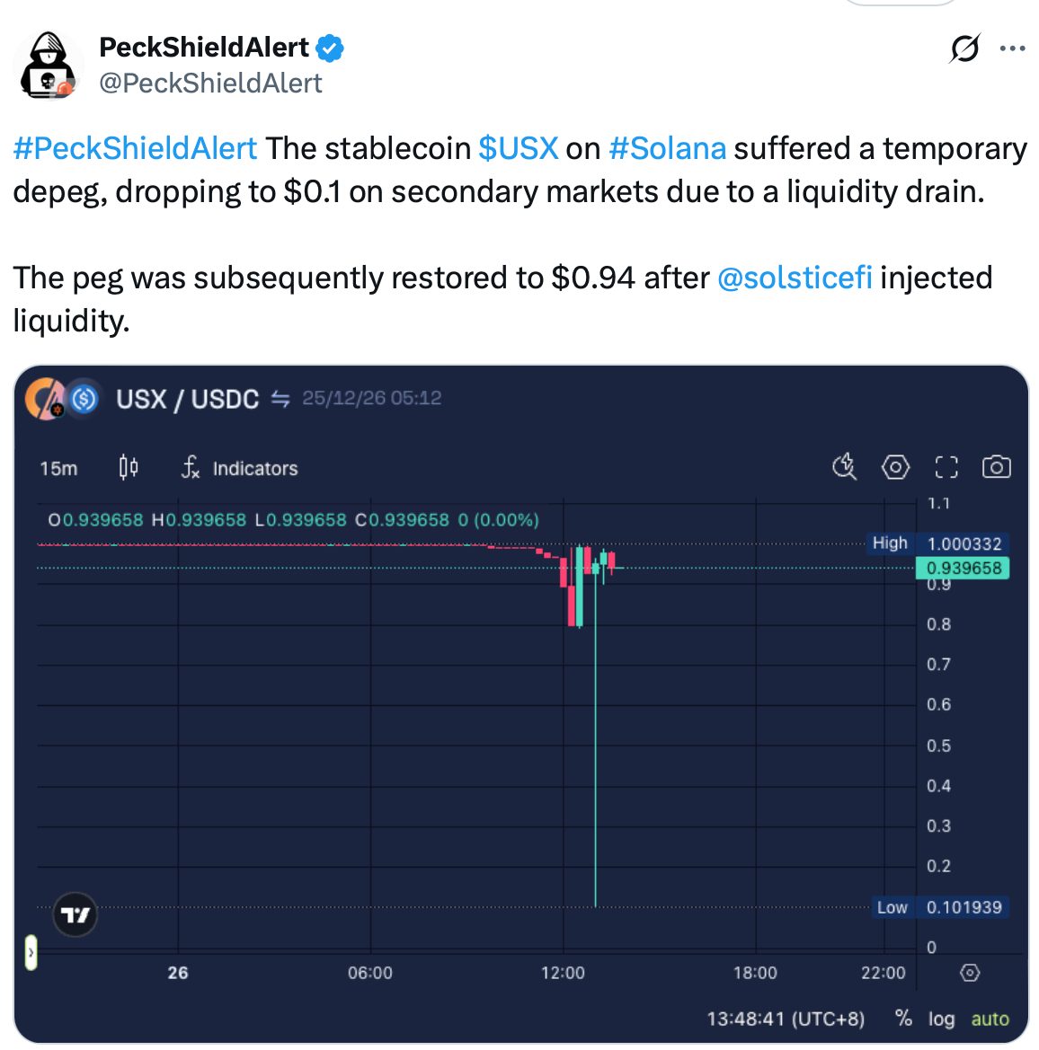 In an X post on Friday, PeckShieldAlert showed USX briefly trading as low as $0.10 in secondary markets before rebounding, a move attributed to isolated trades executed during a period of extremely thin liquidity.