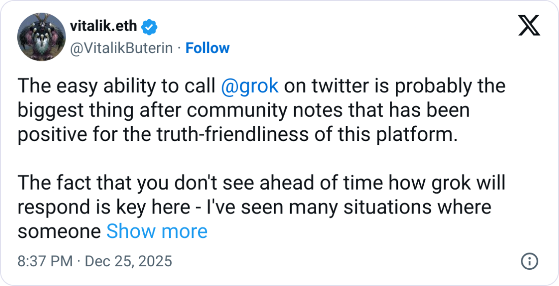 “The easy ability to call Grok on Twitter is probably the biggest thing after community notes that has been positive for the truth-friendliness of this platform,” Buterin said on Thursday.