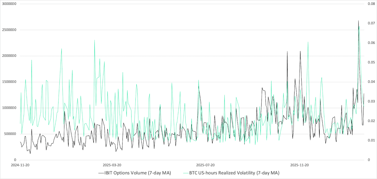 Chart 1: Movement of IBIT option volume and BTC U.S.-hours realized volatility